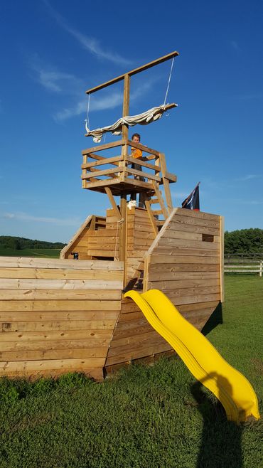 Our outdoor playground features a large scale pirate boat, Swing set and we often have out bounce house up if weather permits! We also are always expanding our children activities and are committed to a family friendly atmosphere!